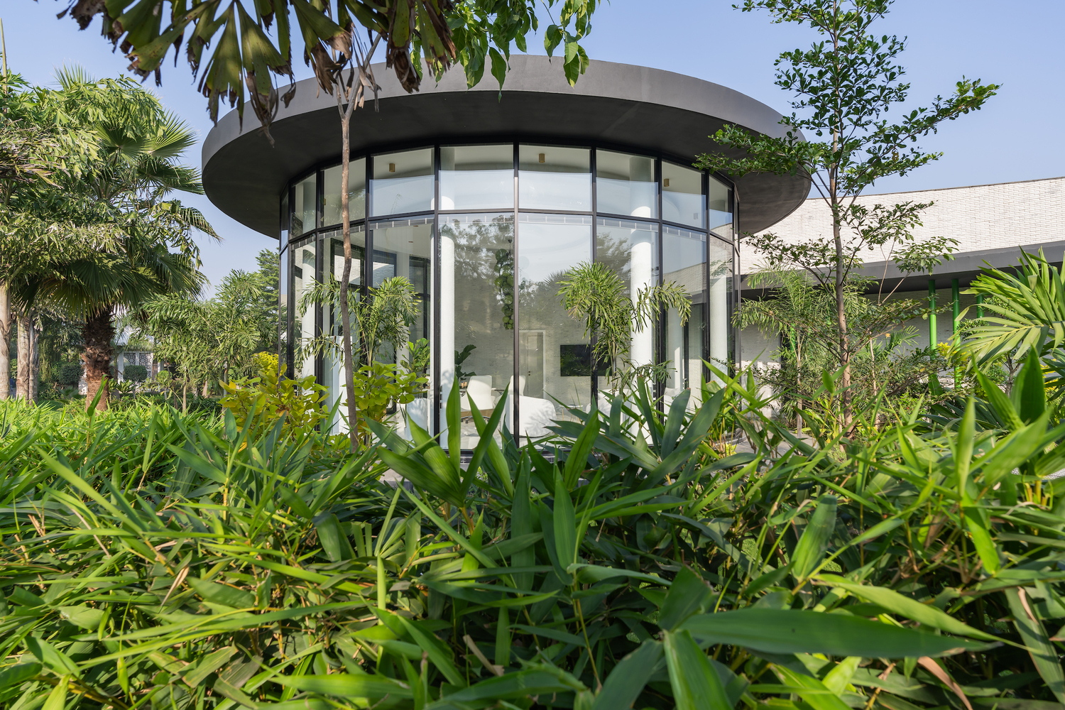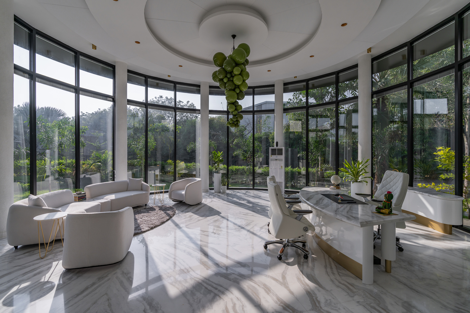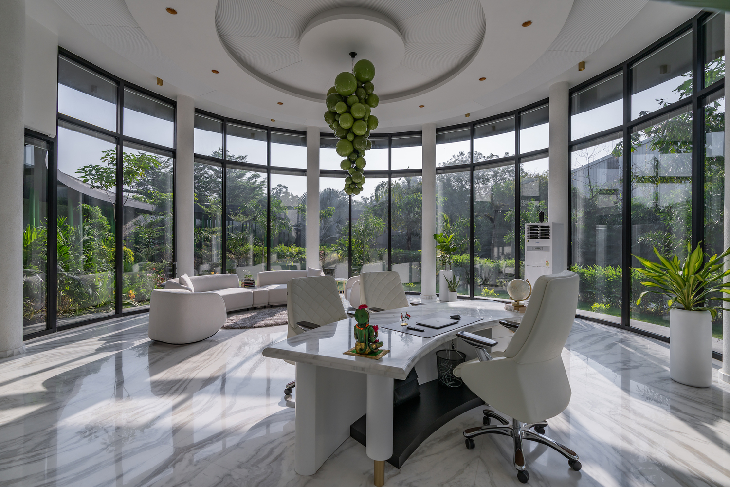 En lugar de una estructura rígida y convencional, el diseño adopta curvas fluidas que imitan las formas orgánicas de la naturaleza, creando un refugio armónico dentro del entorno industrial. La recepción, abierta en todas direcciones, actúa como un umbral transparente donde la vegetación penetra sutilmente en el interior, desdibujando los límites entre lo construido y lo natural. Desde este punto de entrada, un corredor flanqueado por jardines conduce a los distintos espacios funcionales, culminando en la oficina del director general, donde una vista panorámica de 270 grados enmarca el paisaje exterior como un cuadro en constante cambio. La orientación sur del edificio y su fachada curvilínea responden inteligentemente a las condiciones climáticas, filtrando la luz solar y mitigando la ganancia térmica, al mismo tiempo que organizan el espacio en capas que equilibran privacidad y apertura.