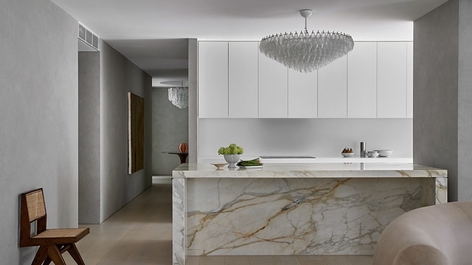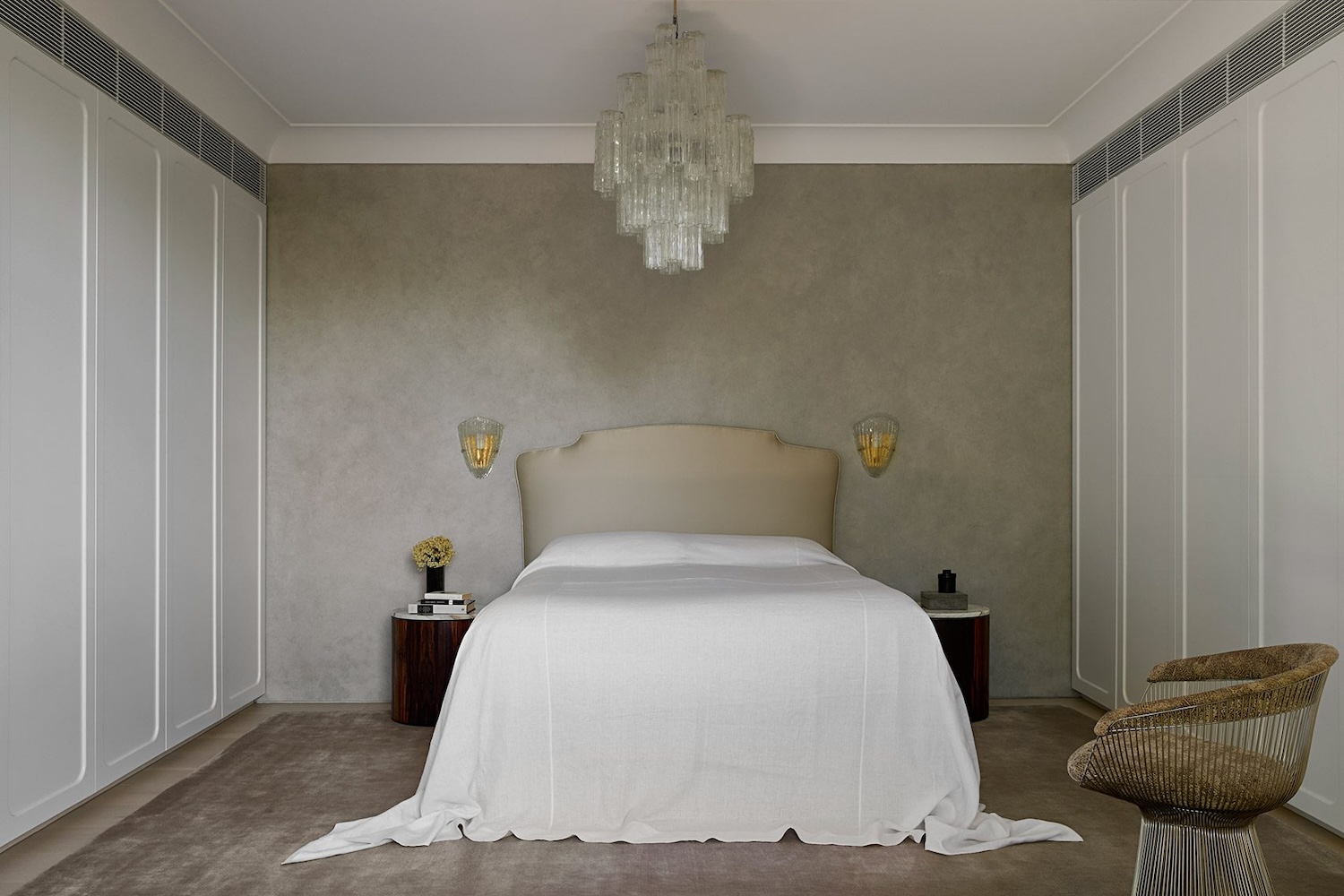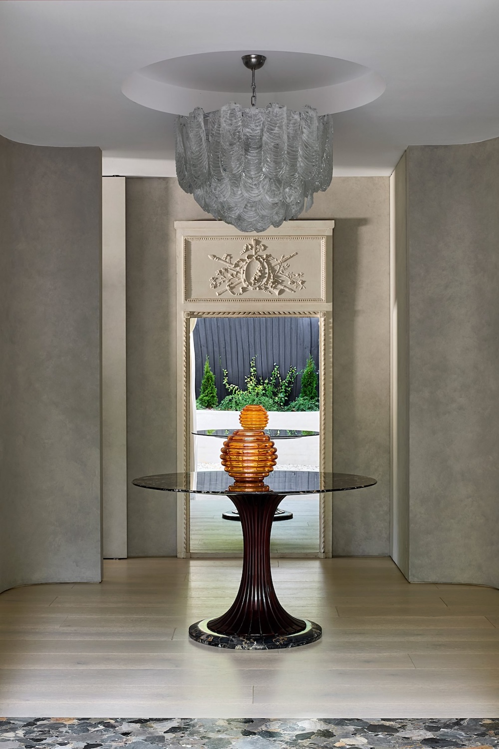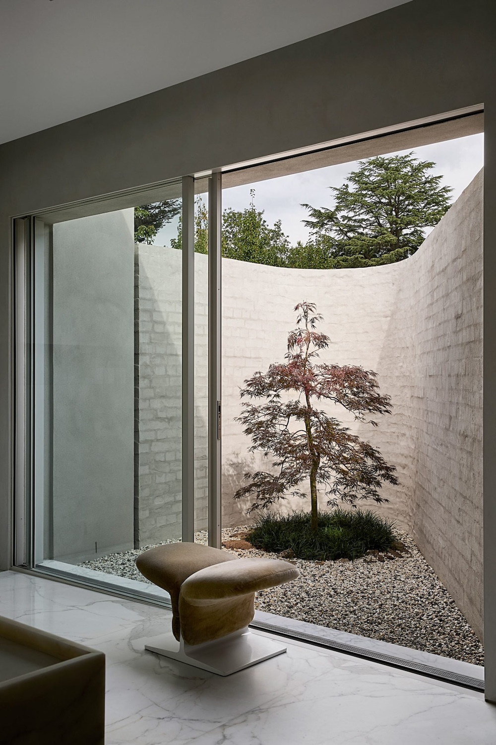 El proyecto se desarrolla desde el interior hacia el exterior, con espacios orientados a la privacidad y a la experiencia sensorial. Paredes de microcemento lavadas en cal, lámparas de Murano y mármoles italianos —Ceppo y Calacatta— conviven con mobiliario curvo y textiles aterciopelados, componiendo una narrativa material que une clasicismo y serenidad contemporánea.